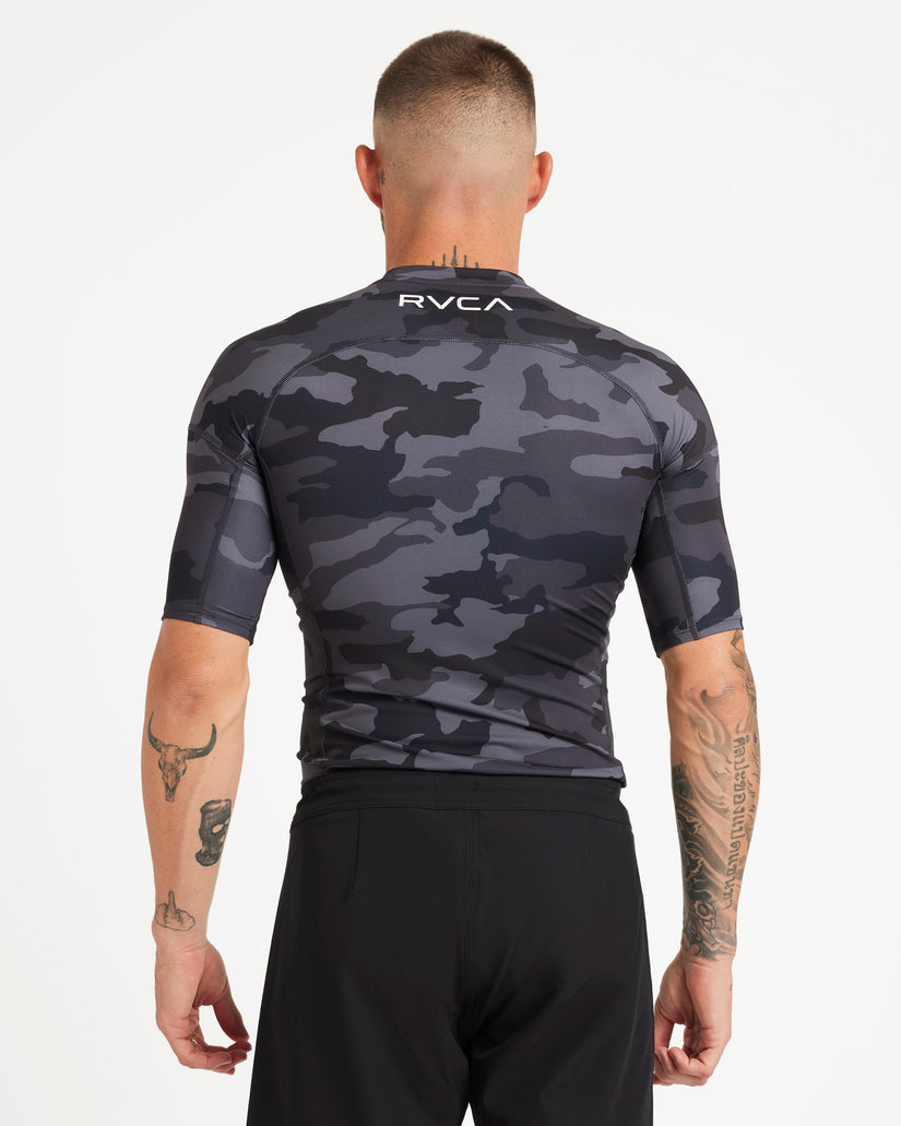 in a range of prints and colors with rvca graphics at the chest, this va sport short-sleeve rashguard is crafted of strong and stretchy recycled fabric offering unbeatable comfort and unrestricted mobility.
